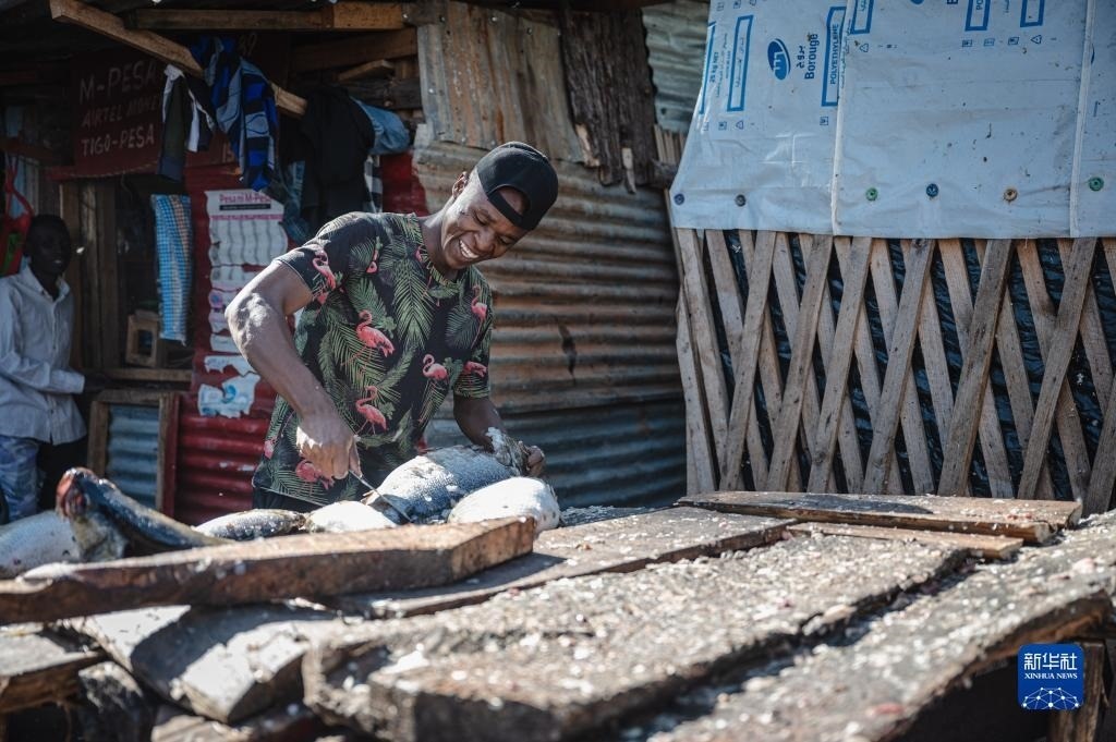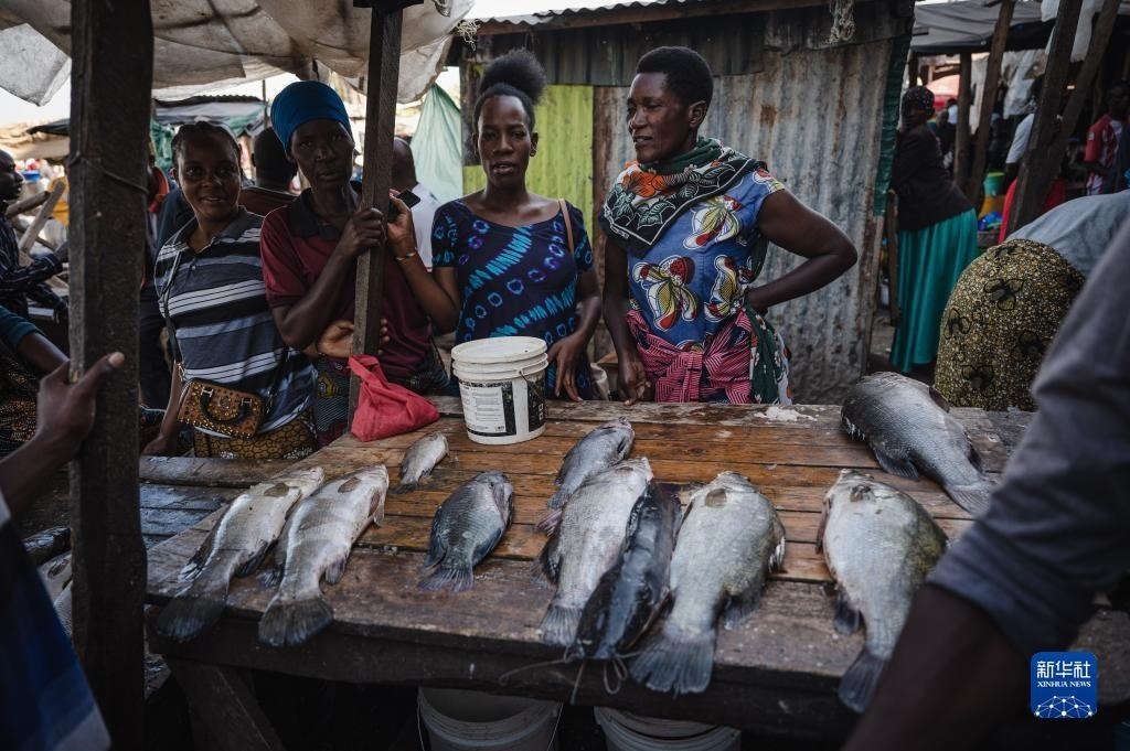6月11日,人們在坦桑尼亞姆萬扎省維多利亞湖畔附近賣魚。