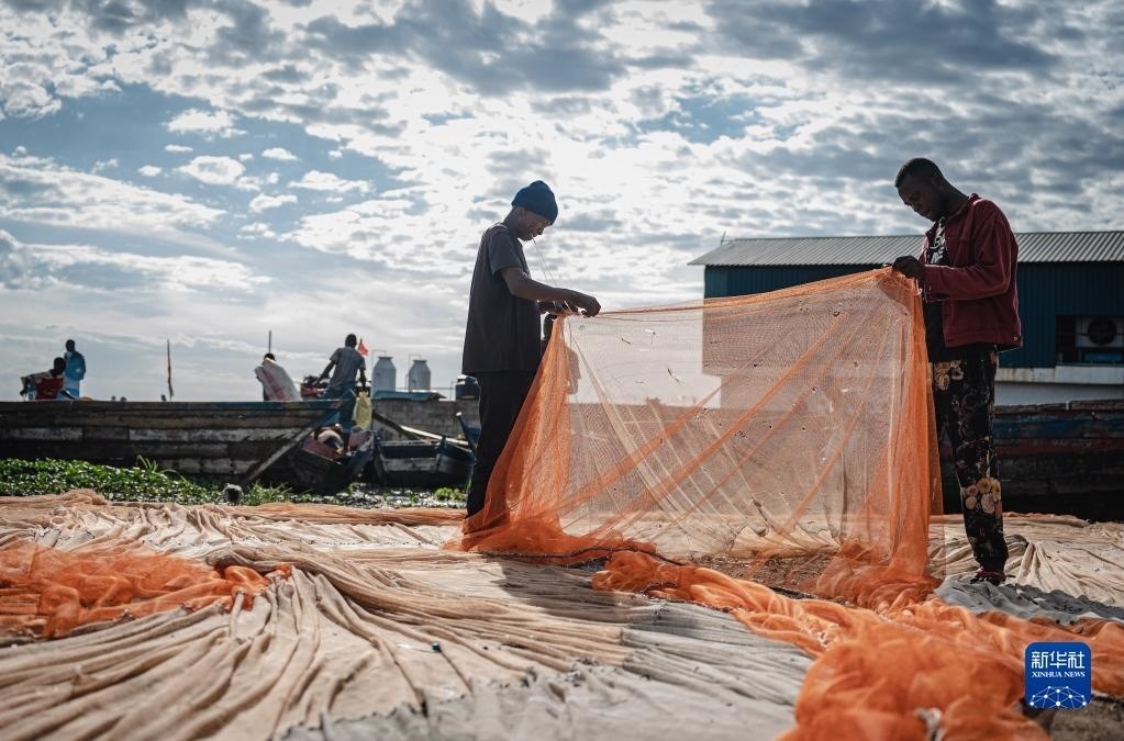 6月10日,坦桑尼亞姆萬扎省維多利亞湖畔的漁民整理漁網。
