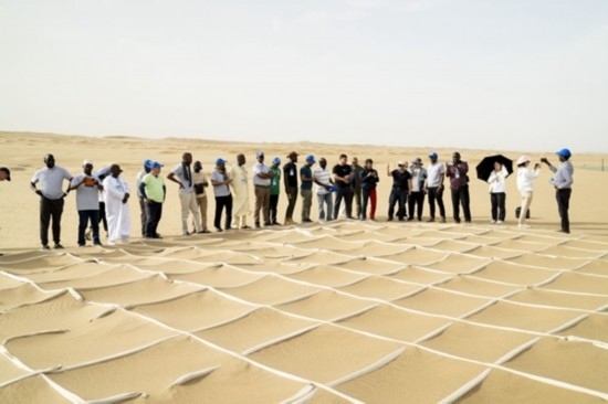 6月12日,在塔克拉瑪干沙漠機械防沙示范區(qū),非洲和中亞學(xué)員參觀固沙新技術(shù)。新華社記者 周生斌 攝