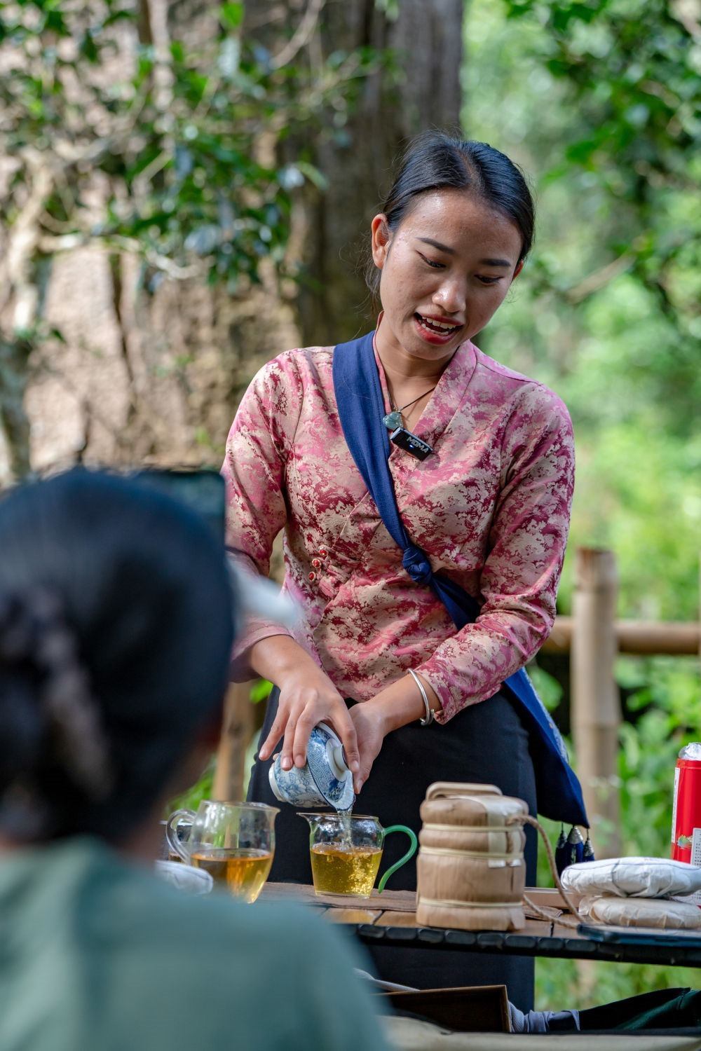 在景邁山大平掌古茶林,一位傣族姑娘在直播賣(mài)茶(9月14日攝)。新華社記者 胡超 攝