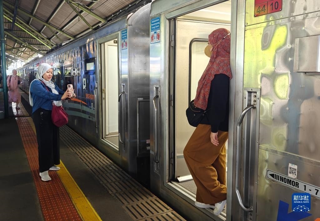 8月27日,乘客在印度尼西亞雅加達(dá)甘比爾車站的站臺(tái)上拍照(手機(jī)拍攝)。新華社記者 徐欽 攝