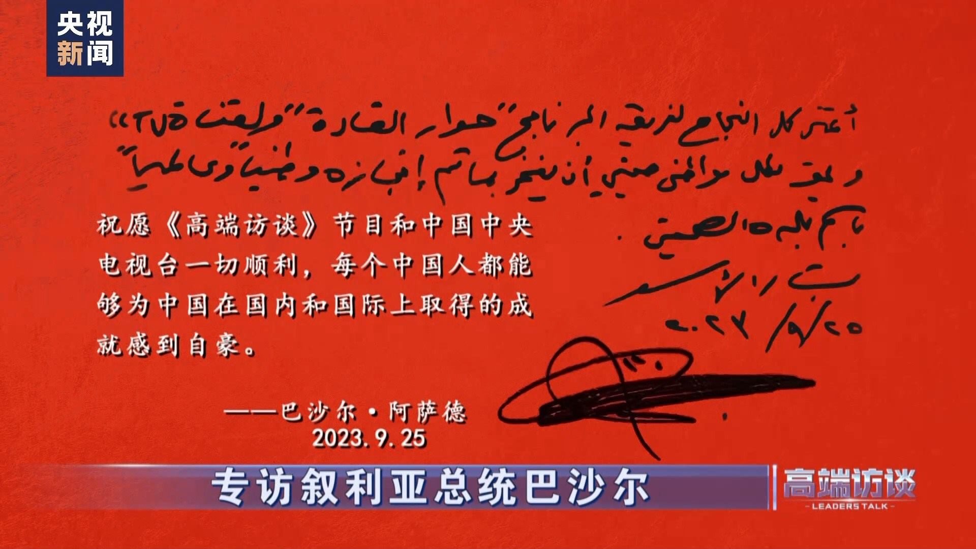 敘利亞總統(tǒng)巴沙爾在接受總臺專訪后題詞:祝愿《高端訪談》節(jié)目和中國中央電視臺一切順利,每個中國人都能夠為中國在國內(nèi)和國際上取得的成就感到自豪!