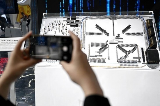 4月26日,觀眾在第二屆中國(安徽)科技創(chuàng)新成果轉(zhuǎn)化交易會上拍攝“九章”光量子計算原型機模型。新華社記者黃博涵 攝