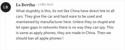 “這是多么愚蠢啊,中國(guó)又不是和所有汽車都有直接聯(lián)系。他們把汽車和硬件交給這里的制造商使用和維護(hù)。除非他們蠢到讓網(wǎng)絡(luò)出現(xiàn)漏洞,否則他們不可能進(jìn)行間諜活動(dòng)。這和蘋果手機(jī)一樣,都是中國(guó)制造的。那么我們應(yīng)該禁止所有蘋果手機(jī)!”