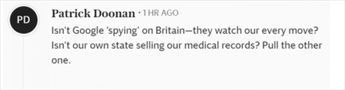 還有網(wǎng)友提到美國(guó)互聯(lián)網(wǎng)巨頭公司,“谷歌不是在‘監(jiān)視’英國(guó)嗎——他們監(jiān)視著我們的一舉一動(dòng)?我們自己的地區(qū)不是在賣我們的醫(yī)療記錄嗎?”