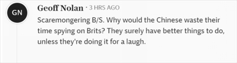 “危言聳聽。中國(guó)人為什么要浪費(fèi)時(shí)間監(jiān)視英國(guó)人?他們肯定有更好的事情要做,除非他們這么做是為了搞笑?!?/p>