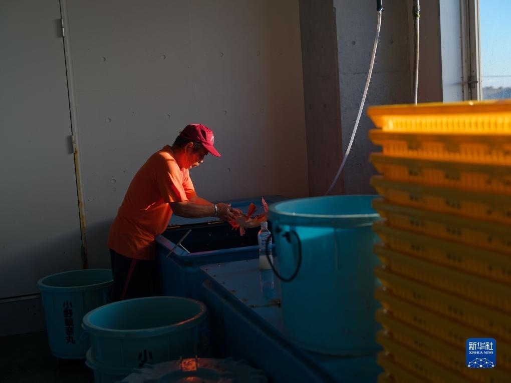 8月23日,打漁歸來(lái)的小野春雄在日本福島縣新地町的漁港處理捕獲的魚。新華社記者 張笑宇 攝