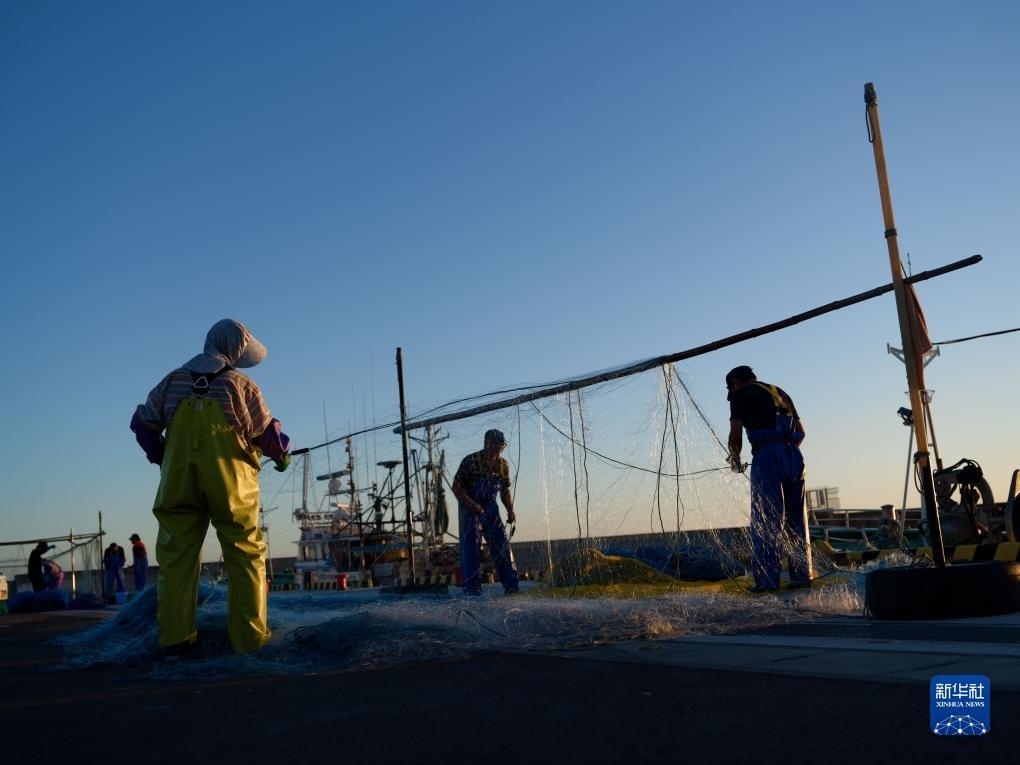 8月23日,捕魚歸來(lái)的漁民在日本福島縣新地町的漁港晾曬漁網(wǎng)。新華社記者 張笑宇 攝