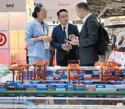 在2023年慕尼黑國際物流博覽會上,工作人員在中鐵集裝箱運輸有限公司展臺前向國外客戶介紹廣州國際港中歐班列站點設(shè)施。本報記者 李 強攝