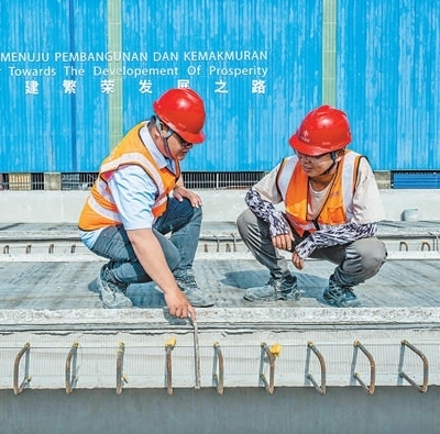馬來西亞吉蘭丹州的馬東鐵項目一分部制梁場,技術人員討論生產(chǎn)情況。新華社記者 朱 煒攝