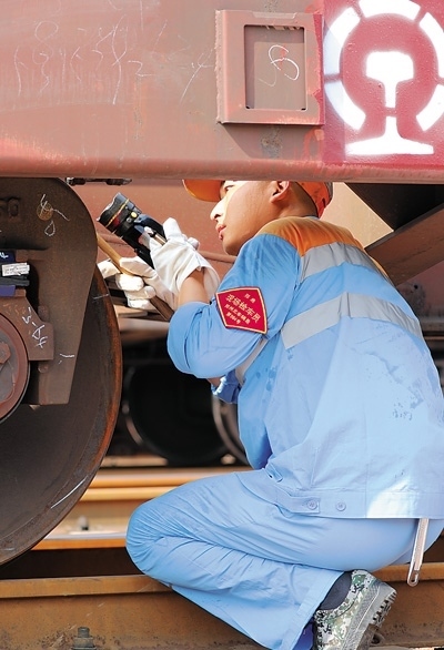 在鄭州北站,一名工人正對車底進(jìn)行檢修。本報(bào)記者 何嘉豪攝