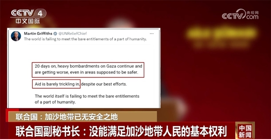 同一天,聯(lián)合國分管人道主義事務(wù)的副秘書長馬丁·格里菲斯在社交媒體發(fā)文稱,在過去20天里,對加沙地帶的猛烈轟炸愈發(fā)嚴(yán)重,一些本該安全的地區(qū)也已經(jīng)陷入危險,但援助物資卻很難進(jìn)入加沙地帶,國際社會沒能滿足一部分人的基本權(quán)利。
