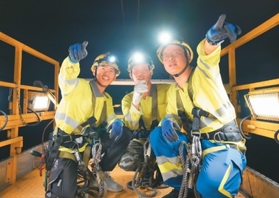 中國(guó)師傅潘貴(右)帶領(lǐng)老撾徒弟馮圖(左)以及馮圖的徒弟康更(中)一同登乘軌道車作業(yè)。