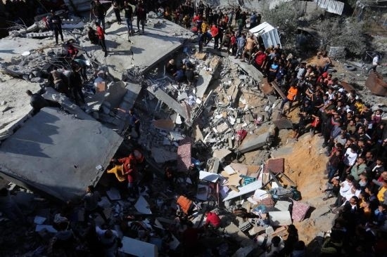 11月23日,人們聚集在加沙地帶南部城市拉法一處廢墟上。新華社發(fā)(哈立德·奧馬爾攝)
