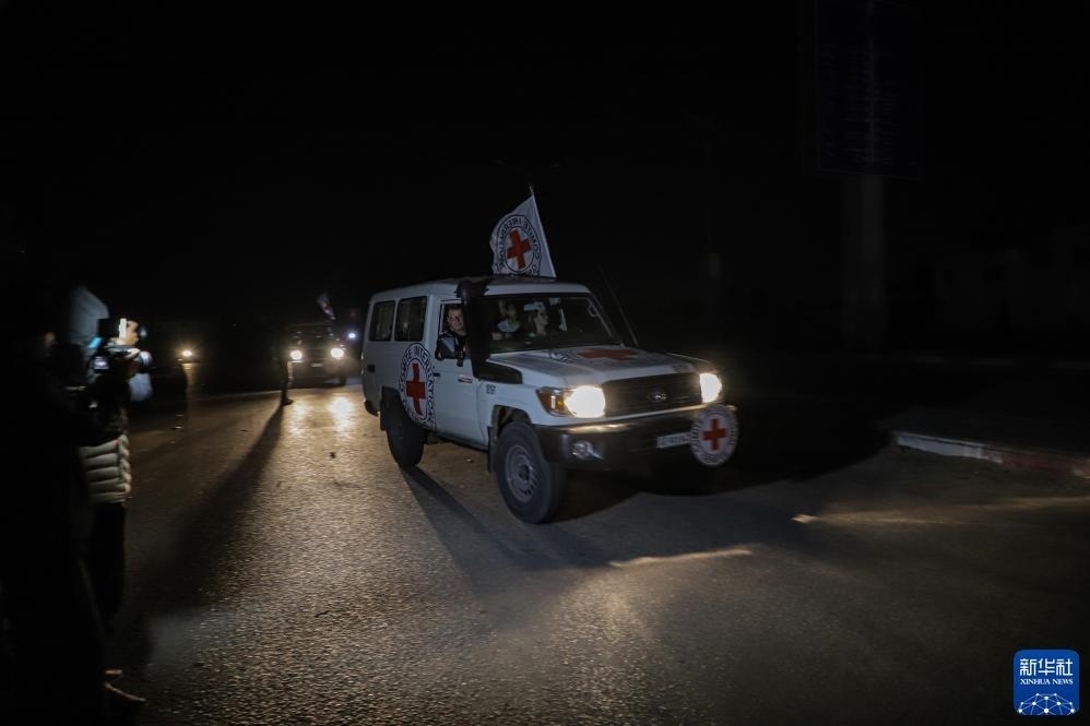 11月25日,紅十字國際委員會工作人員將被釋放人員送往加沙地帶南部拉法口岸。新華社發(fā)(里澤克·阿卜杜勒賈瓦德攝)