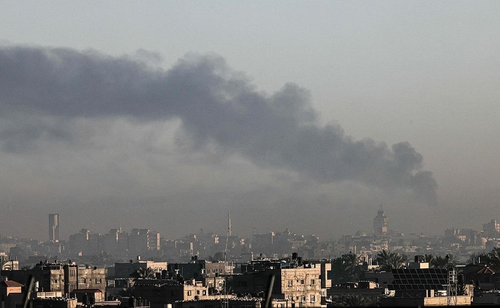△當(dāng)?shù)貢r(shí)間12月15日,以色列空襲過后,加沙地帶南部城市汗尤尼斯上空濃煙滾滾。