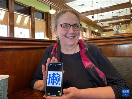 1月9日,在美國得克薩斯州達(dá)拉斯,朱麗葉·托馬斯用手機(jī)展示她的微信頭像“懶”字,意在提醒所有人監(jiān)督她學(xué)中文要勤奮,不要偷懶。新華社發(fā)(田丹攝)