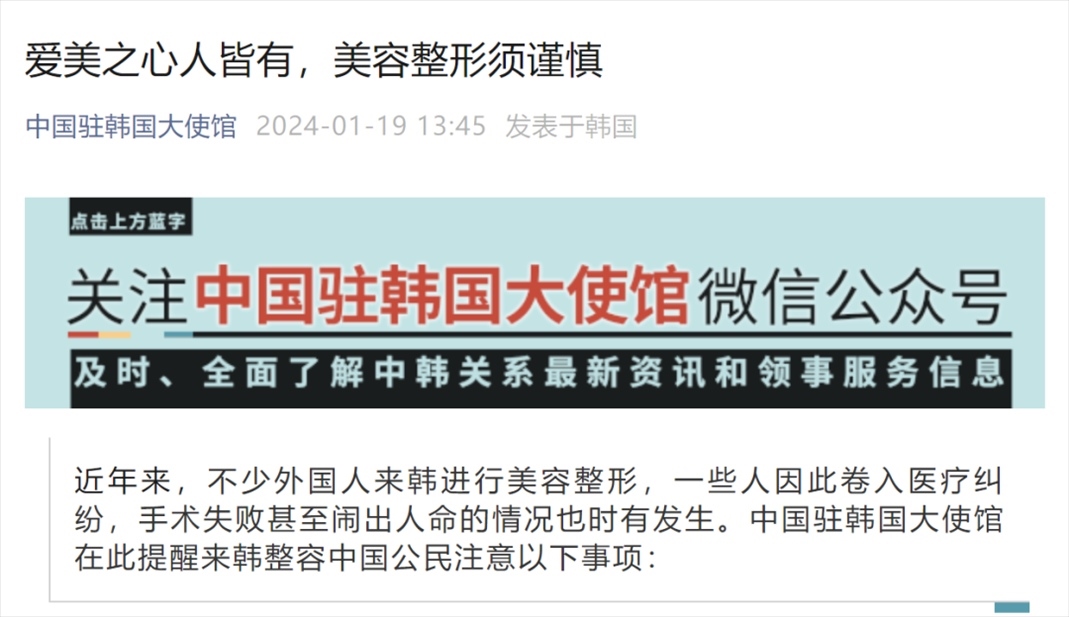 1月19日,中國駐韓國大使館提醒來韓整容中國公民注意以下事項(xiàng):