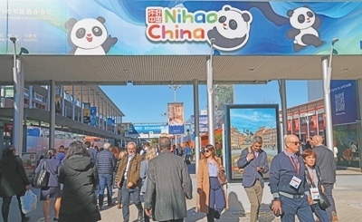 會展中心外側(cè)主通道的顯著位置,印有“你好!中國”國家旅游形象圖案的廣告牌。 本報記者 許海林?jǐn)z