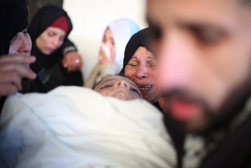 2月3日,在加沙地帶南部城市拉法,巴勒斯坦人悼念死者。新華社發(fā)(哈立德·奧馬爾攝)