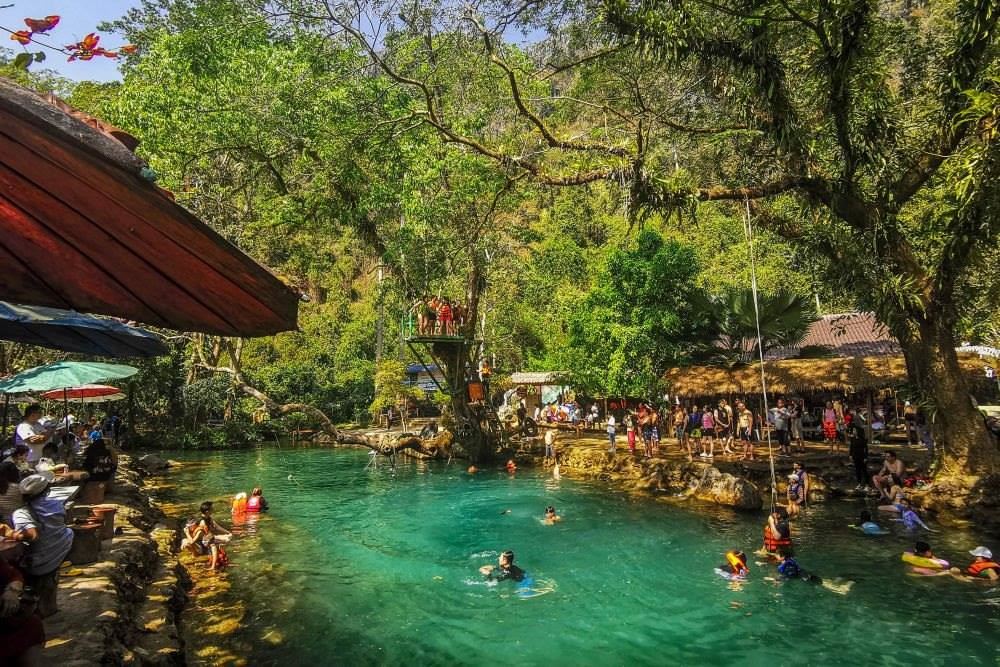 2月14日,中國(guó)游客在老撾萬榮藍(lán)色瀉湖游玩。