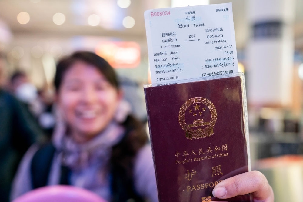 2月14日,乘坐中老鐵路國(guó)際旅客列車前往老撾的游客展示購買到的車票。