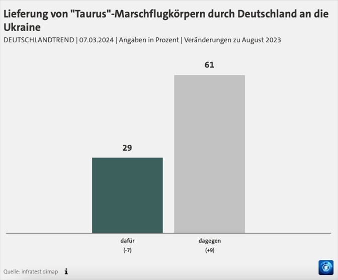 根據(jù)德國(guó)電視一臺(tái)當(dāng)?shù)貢r(shí)間7日公布的最新“德國(guó)趨勢(shì)”民調(diào),在“竊聽(tīng)門”事件發(fā)生后,61%的德國(guó)民眾反對(duì)向?yàn)蹩颂m提供“金牛座”巡航導(dǎo)彈,較去年8月的民調(diào)結(jié)果增長(zhǎng)了9%;支持的民眾數(shù)量減少了7%,占比僅為29%。民調(diào)還顯示,70%的受訪者擔(dān)心間諜活動(dòng)增加,67%的人擔(dān)心德國(guó)對(duì)此缺乏準(zhǔn)備,還有62%的民眾擔(dān)心德國(guó)可能會(huì)直接卷入戰(zhàn)爭(zhēng)。