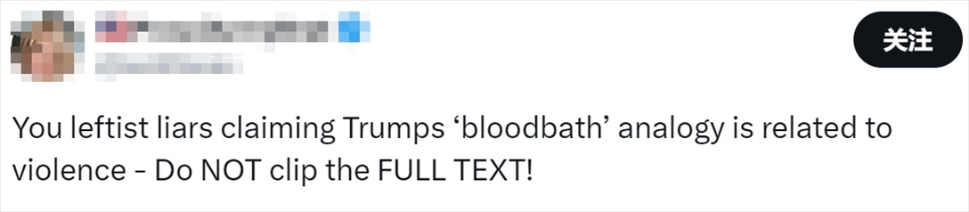 近來(lái),美國(guó)民主黨與共和黨之間的政治斗爭(zhēng)愈發(fā)激烈,美國(guó)輿論兩極分化。特朗普稱(chēng)“若自己不當(dāng)選美國(guó)將發(fā)生屠殺”的言論再次在美國(guó)網(wǎng)絡(luò)上引發(fā)爭(zhēng)論。在社交媒體X上,有人批評(píng)稱(chēng):“特朗普對(duì)社會(huì)是個(gè)威脅。”
