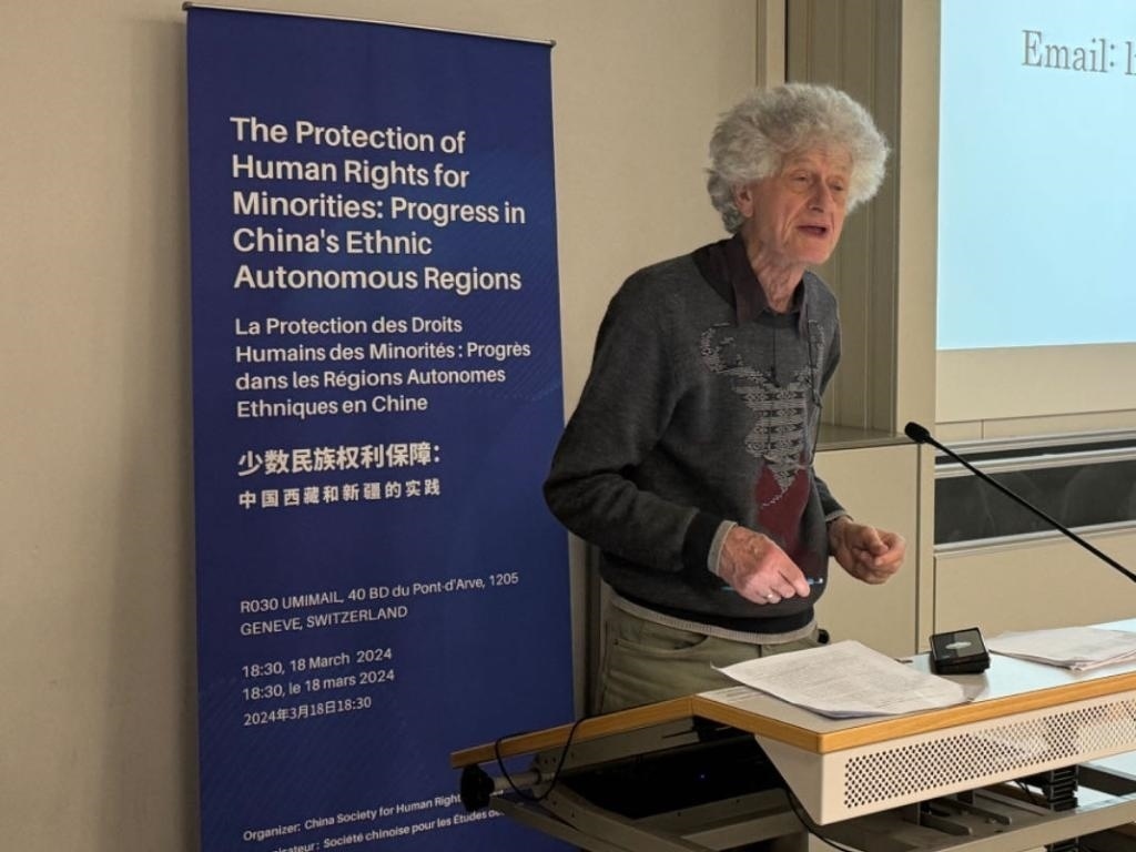 ?3月18日,由中國人權研究會主辦的“少數(shù)民族權利保障:中國西藏和新疆實踐”主題講座在瑞士日內(nèi)瓦舉行。圖為比利時知名藏學家安德烈·拉克魯瓦在講座上發(fā)言。新華社記者石松攝