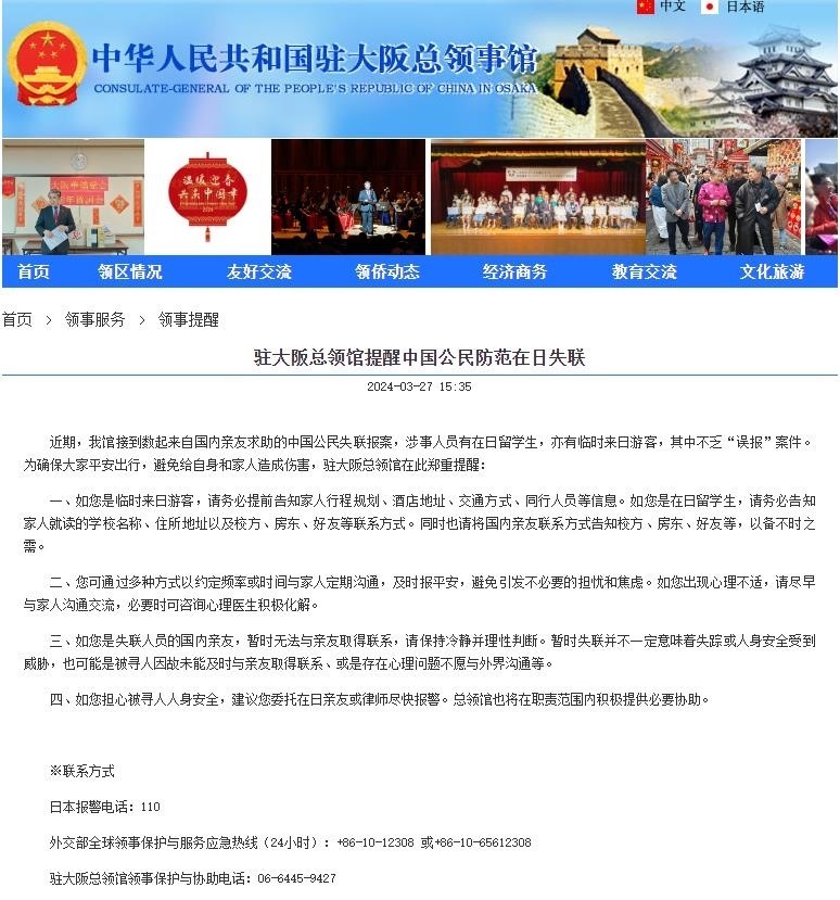 央視網(wǎng)消息:據(jù)中國駐大阪總領事館,近期,我館接到數(shù)起來自國內親友求助的中國公民失聯(lián)報案,涉事人員有在日留學生,亦有臨時來日游客,其中不乏“誤報”案件。為確保大家平安出行,避免給自身和家人造成傷害,駐大阪總領館在此鄭重提醒:??