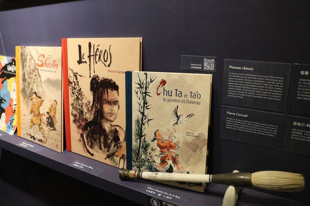 這是3月23日在“甲子情深——中法百姓故事展”上拍攝的法國畫家皮埃爾·科尼埃爾創(chuàng)作的“中國風(fēng)”法語繪本及其在中國訪問期間獲贈的毛筆。新華社記者張百慧攝