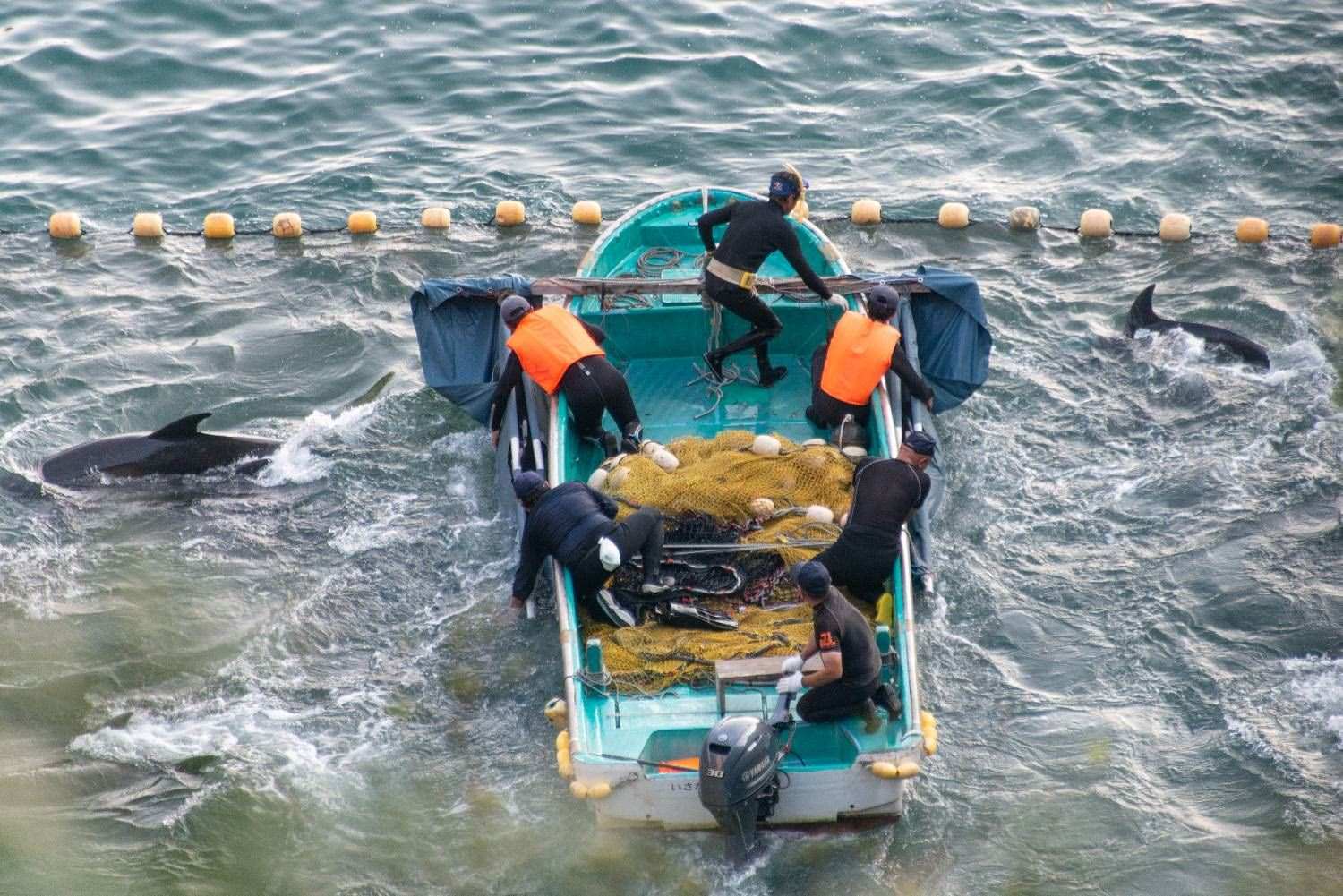 太地町又被稱為“海豚灣”,紀(jì)錄片《海豚灣》曾揭露該地屠殺海豚的血腥景象。每年9月到次年3月,捕鯨者們會聚集在太地町,捕殺海豚或其它小型鯨類。捕鯨者們將鋼桿放入海中,用錘子敲打,在水下形成聲墻,這些鋼柱兩端的金屬 "風(fēng)扇"會放大敲擊聲,使海豚迷失方向。隨后,捕鯨船會逼近海豚,將它們引入 "海灣",拉網(wǎng)誘捕,開啟“挑選海豚”的流程。作為肉類出售的海豚會被血腥屠殺。