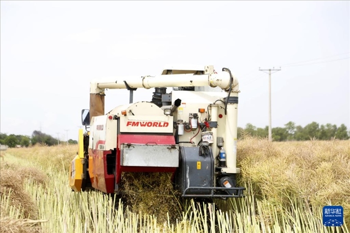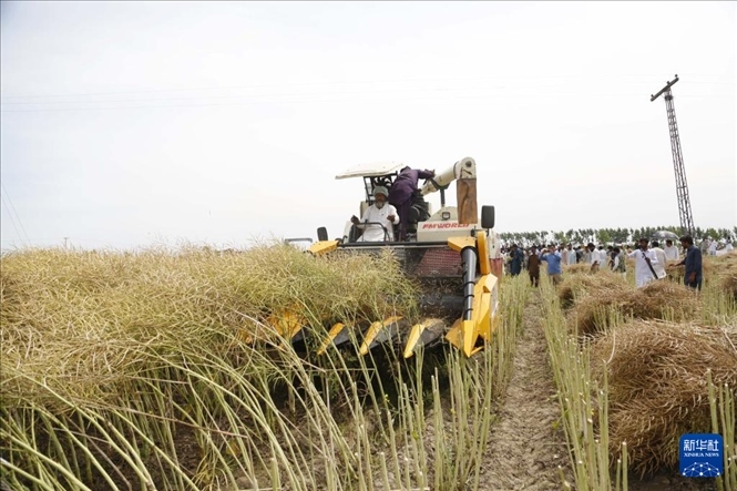 4月17日,一臺(tái)從中國引進(jìn)的油菜籽收割機(jī)在巴基斯坦東部旁遮普省珀格爾地區(qū)一處農(nóng)田進(jìn)行收割作業(yè)。新華社發(fā)(艾哈邁德·卡邁勒攝)