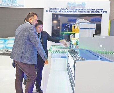 2023年11月,在法國巴黎舉行的第五屆世界核能工業(yè)博覽會上,參觀者在中國廣核集團(tuán)有限公司展臺前了解“華龍一號”核電機(jī)組模型。本報記者 尚凱元攝