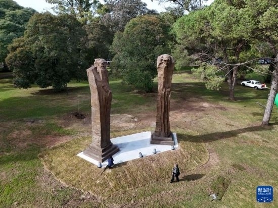 這是5月29日在烏拉圭首都蒙得維的亞市中心的巴特列公園拍攝的雕塑作品《問道》(無人機照片)。新華社發(fā)(尼古拉斯·塞拉亞攝)