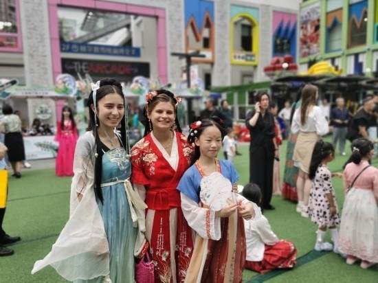 6月9日,端午小長(zhǎng)假第二天,在上海金橋的一處商業(yè)中心里,身著中國(guó)古代服飾的外國(guó)人與中國(guó)兒童合影。新華社記者 陳愛(ài)平 攝