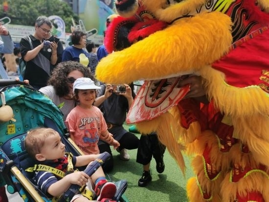 6月9日,端午小長(zhǎng)假第二天,在上海金橋的一處商業(yè)中心里,外國(guó)小朋友近距離觀看傳統(tǒng)舞獅。新華社記者 陳愛(ài)平 攝