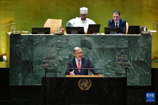 9月24日,在位于紐約的聯(lián)合國總部,聯(lián)合國秘書長古特雷斯(前)在第79屆聯(lián)合國大會一般性辯論開幕式上致辭。新華社記者 李睿 攝