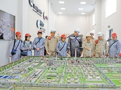 人民日?qǐng)?bào)和哈薩克斯坦媒體“高質(zhì)量共建‘一帶一路’”聯(lián)合采訪團(tuán)隊(duì)近日來(lái)到哈薩克斯坦奇姆肯特市,采訪了奇姆肯特?zé)拸S現(xiàn)代化改造項(xiàng)目。圖為聯(lián)合采訪團(tuán)隊(duì)在奇姆肯特?zé)拸S沙盤(pán)前聽(tīng)取情況介紹。本報(bào)記者 趙益普攝
