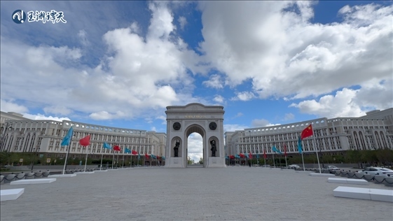 ||譚主抵達阿斯塔納,象征著哈薩克斯坦歷史的“凱旋門”周圍飄揚著歡迎旗幟