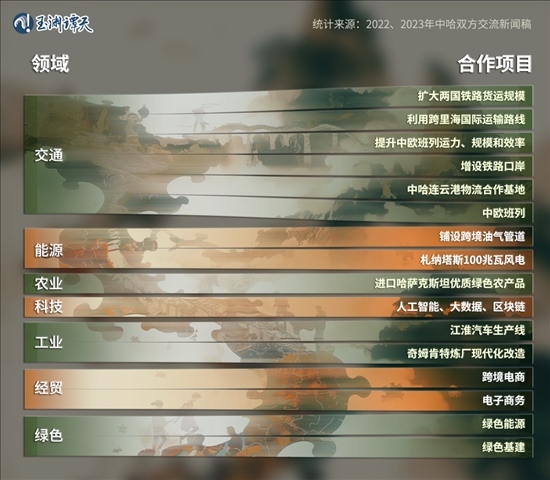 這兩年間,中哈提到的合作項目,涉及交通、能源、工業(yè)、農(nóng)業(yè)、經(jīng)貿(mào)、科技等多個領域,其中出現(xiàn)頻次最多的,是交通——從“中歐班列”、“增設鐵路口岸”,再到“中哈連云港物流合作基地”。