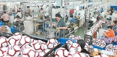 湖南省邵陽(yáng)市洞口縣工業(yè)園區(qū),金美達(dá)體育用品有限公司員工在生產(chǎn)足球,趕制出口訂單產(chǎn)品。滕治中攝(人民視覺(jué))