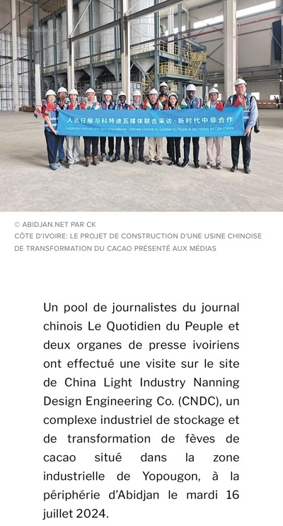 7月16日,人民日報與兩家科特迪瓦新聞機(jī)構(gòu)記者一行參觀了由中國輕工業(yè)南寧設(shè)計工程有限公司總承包的可可加工及可可豆倉庫建設(shè)項(xiàng)目,該項(xiàng)目坐落在阿比讓郊區(qū)的約普貢工業(yè)區(qū)。該公司負(fù)責(zé)人指出,該項(xiàng)目綜合體計劃于2024年年底完工,包括一個可加工5萬噸可可豆的工廠、可存儲14萬噸可可豆的倉庫以及培訓(xùn)中心、行政大樓等?!钥铺氐贤甙⒈茸尵W(wǎng)報道