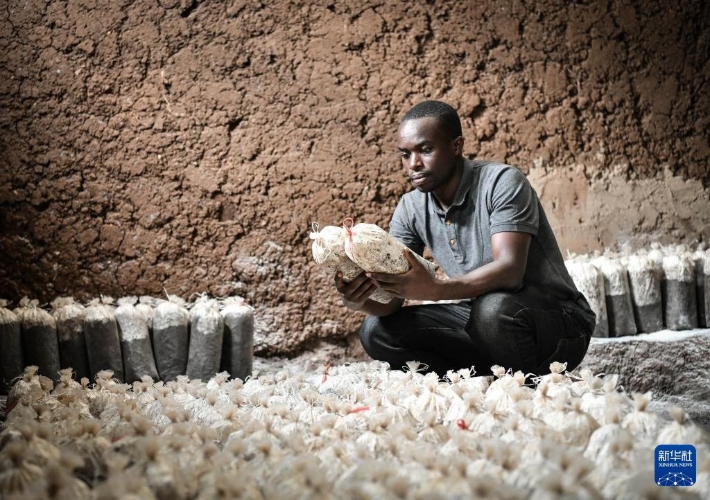 8月14日,在盧旺達(dá)南方省穆漢加區(qū),尼揚(yáng)博·奧貝德在食用菌培育工坊內(nèi)檢查菌袋。曾兩次赴中國(guó)進(jìn)行菌草技術(shù)培訓(xùn)的尼揚(yáng)博·奧貝德在南方省和東方省各擁有一家工坊。