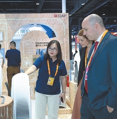 在服貿(mào)會(huì)首鋼園環(huán)境服務(wù)專題展館內(nèi),艾可愛爾展臺(tái)工作人員為參展觀眾講解空氣凈化整體解決方案。張京飛攝
