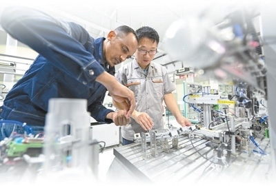 天津職業(yè)技術(shù)師范大學埃塞俄比亞博士留學生涂則鋼(左)在老師的指導下調(diào)試儀器。新華社記者 孫凡越攝