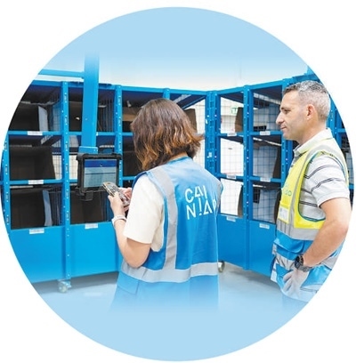 在菜鳥(niǎo)西班牙海外倉(cāng),兩名工作人員正在使用菜鳥(niǎo)自主研發(fā)的智能分揀柜系統(tǒng)進(jìn)行包裹分揀。 本報(bào)西班牙分社 大衛(wèi)·阿瑪爾攝