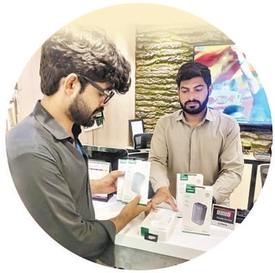 中國(guó)企業(yè)位于巴基斯坦的海外倉(cāng)將中國(guó)制造的數(shù)碼產(chǎn)品等高附加值貨物快速配送至本地線下零售商網(wǎng)絡(luò),顯著提升效率和靈活性。圖為海外倉(cāng)的送貨員正在與當(dāng)?shù)厣虘艚唤迂浳?。本?bào)巴基斯坦分社 賽義德·邁赫迪攝
