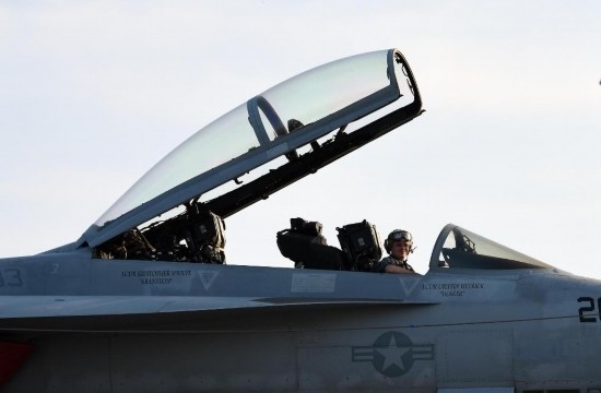 2017年7月22日,在美國(guó)弗吉尼亞州諾??撕\娀兀w行員坐在“福特”號(hào)航母上的F/A-18戰(zhàn)斗機(jī)中。新華社記者殷博古攝