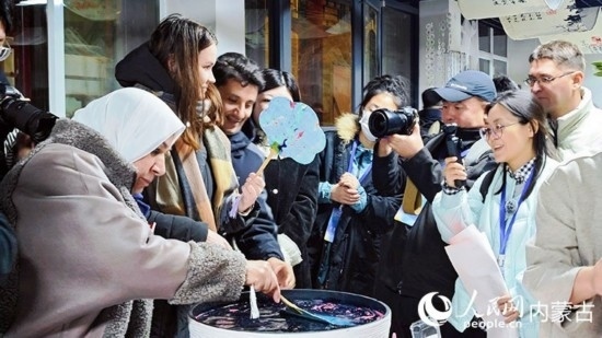 外媒記者正在制作“漆扇”。人民網(wǎng)記者 張雪冬攝